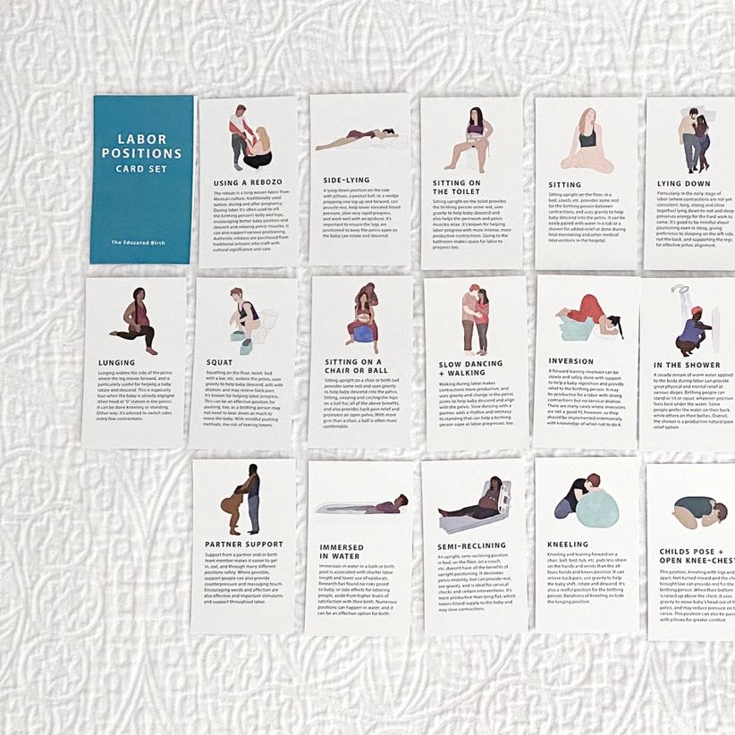 keeping a set of reference cards on hand can be a quick way to help clients visualize and understand specific positioning, and explain why each one could be helpful for the different stages of labor